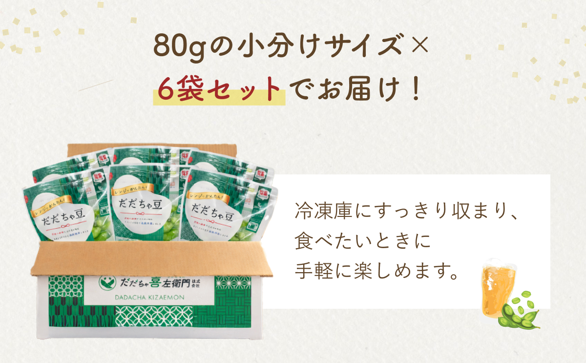 【冷凍だだちゃ豆】鶴岡産 さや付き 80g×6袋| 食べきり小分け・レンジで簡単な冷凍枝豆(おつまみ・おやつ)だだちゃ喜左衛門株式会社