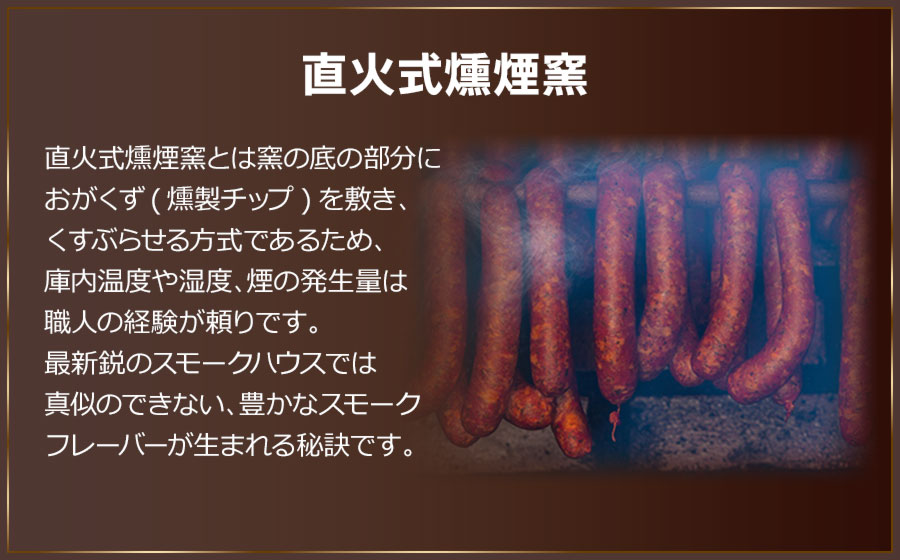 最新鋭のスモークハウスでは真似のできない、豊かなスモークフレーバーが生まれる秘訣です。