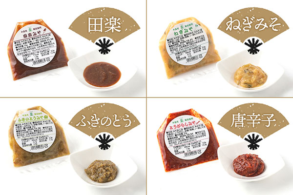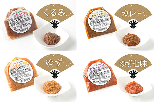 原材料:米みそ(国内製造)、くるみ、ごま、ゆず、ゆず七味、カレー粉、酢、とうがらし、しょうが、えごま、アーモンド、ふきのとう、ねぎ、砂糖/酒精