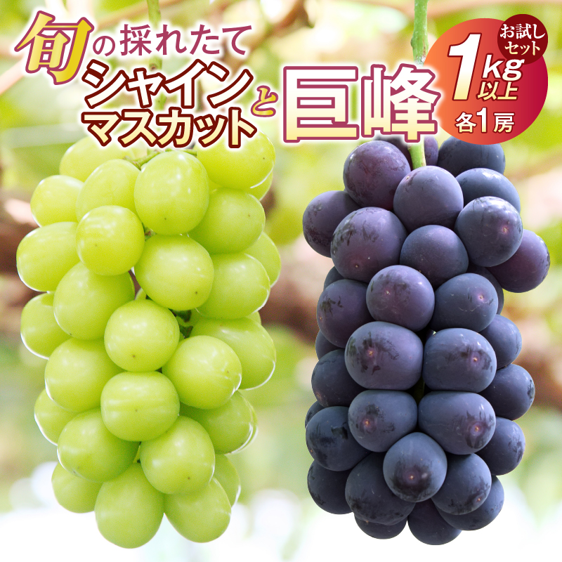 新鮮で甘さと酸味のバランスが程よい元祖黒系のぶどう『巨峰』と、種なしで皮ごと食べられ新鮮で甘くてジューシー、上品で華やかなマスカットらしい香りでぷりっとした食感の『シャインマスカット』を楽しめるお試しセット