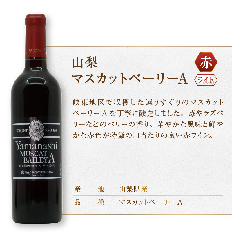 特徴:山梨県峡東地区のマスカット・ベーリーAを丁寧に醸造し、小樽にて7ヶ月熟成しました。