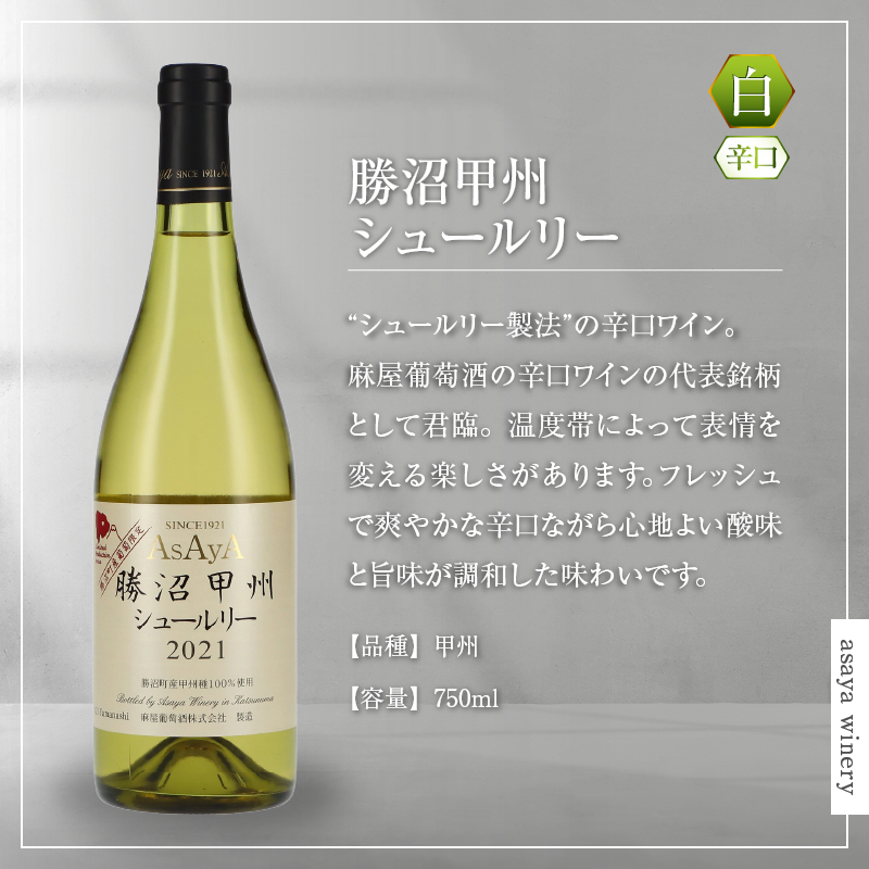 特徴:“シュールリー製法”の辛口ワイン。麻屋葡萄酒の辛口ワインの代表銘柄として君臨。温度帯によって表情を変える楽しさがある。フレッシュで爽やかな辛口ながら心地よい酸味と旨味が調和した味わい。