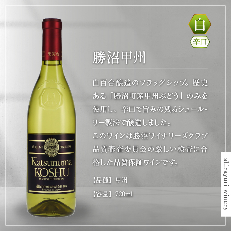 特徴:白百合醸造のフラッグシップ。歴史ある「勝沼町産甲州ぶどう」のみを使用し、辛口で旨みの残るシュール・リー製法で醸造しました。このワインは勝沼ワイナリーズクラブ品質審査委員会の厳しい検査に合格した品質保証ワインです。
