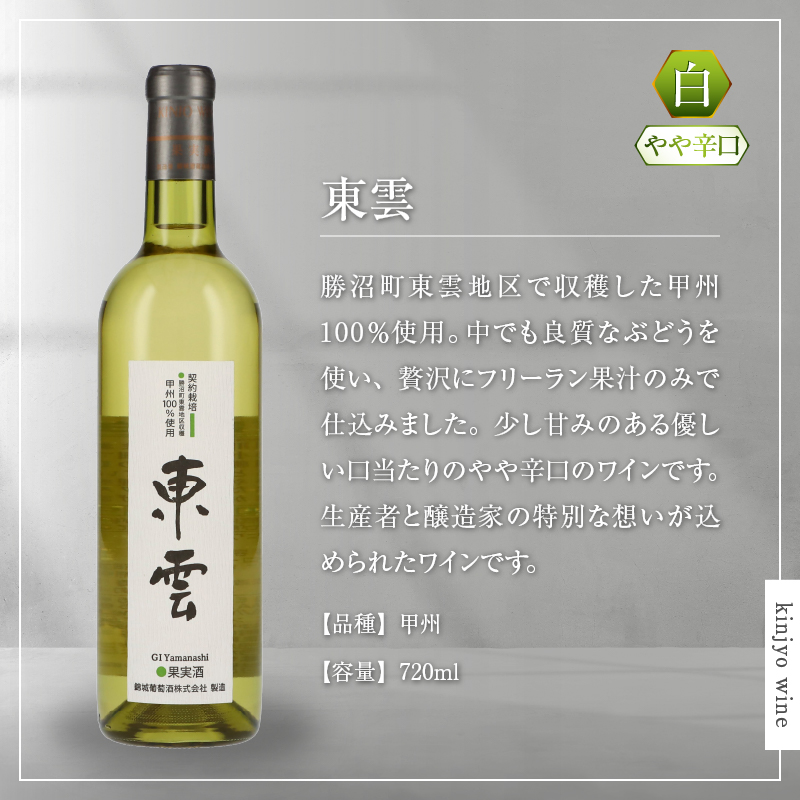 特徴:勝沼町東雲地区で収穫した甲州100%使用。中でも良質なぶどうを使い、贅沢にフリーラン果汁のみで仕込みました。少し甘みのある優しい口当たりのやや辛口のワインです。生産者と醸造家の特別な想いが込められたワインです。