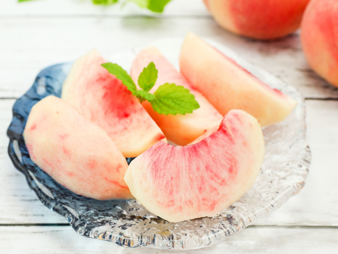 その他の品種と比べて、果皮は地色が白く、日光に当たった部分が紅色に染まるのが特徴です。果汁を豊富に含み、果肉はやわらかく、ほどよい甘さと酸味は控えめです。なのに、とろけるような口当たりが人気のゆえんです。