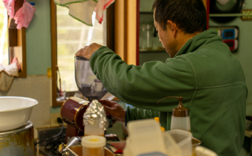 焙煎作業の間は、五感をフルに活用し、1ハゼ、2ハゼ、煎り込み、釡出しのタイミングなど見極めながら、そのイメージに近づけるために全神経を集中しています。