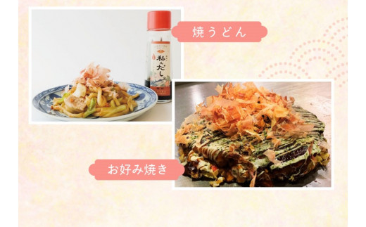 ふわふわとろける触感の「花舞かつお」と自分好みに作る万能調味料、「私んだしっ」のセットです。卵かけご飯にはもちろん、焼うどんやおにぎり、お刺身など様々なお料理にお楽しみいただけます。