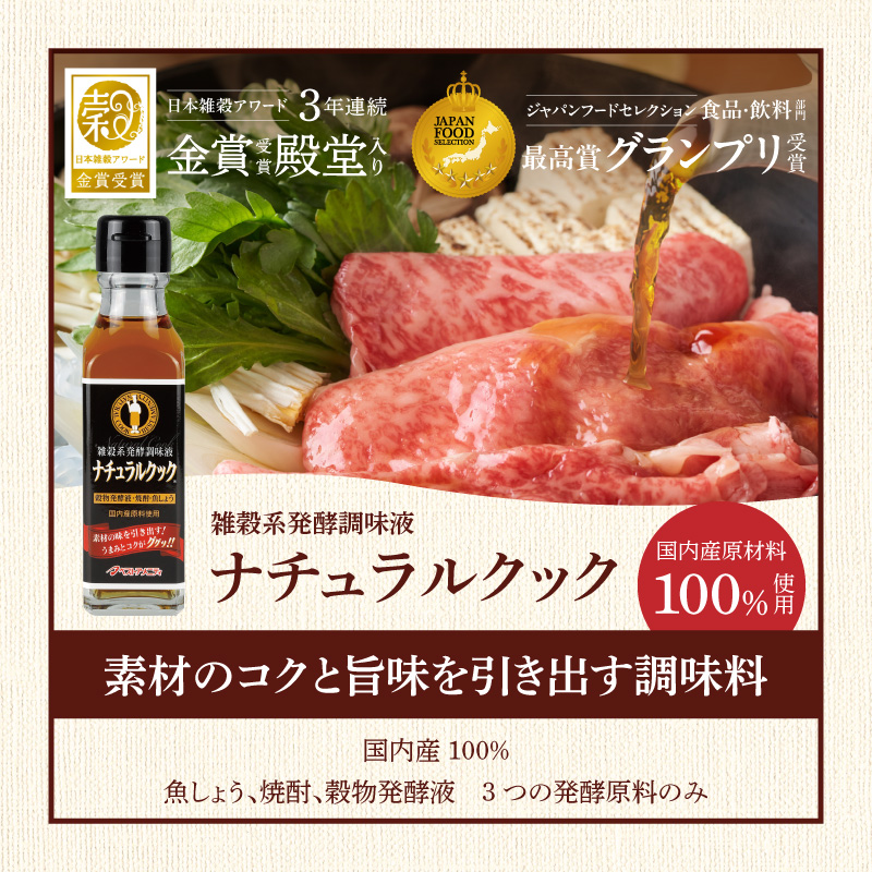 ナチュラルクックは素材のコクと旨味を引き出す調味料で、お肉やお魚を柔らかくジューシーにしてくれます。また、減塩・減糖レシピに最適です。