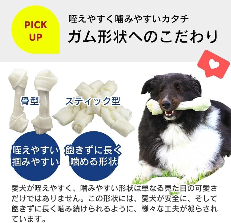 愛犬が好む優しいミルク風味なので、食いつきが良く、飽きずに最後まで楽しめます。牛皮特有のニオイが苦手なワンちゃんにもおすすめです。おやつとしてだけでなく、ご褒美としても最適です。