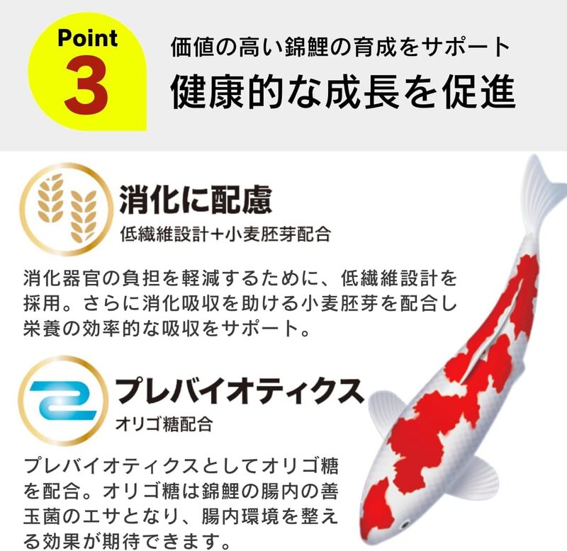 オリゴ糖を配合することで、錦鯉の腸内環境を整え、健康維持をサポートします。
