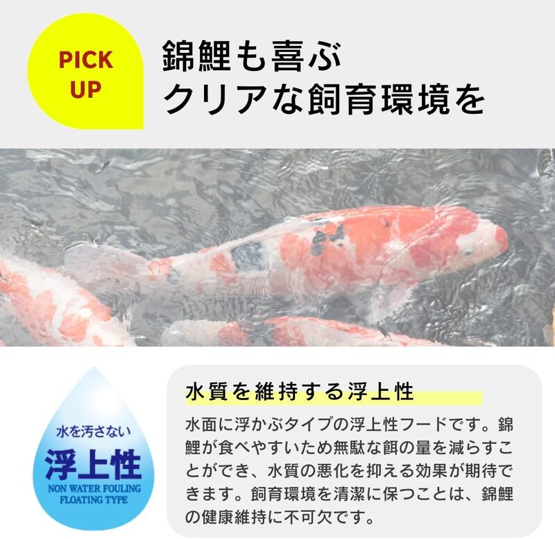 水面に浮かぶタイプのフードなので、錦鯉が食べやすく、水の汚れを抑えることができます。