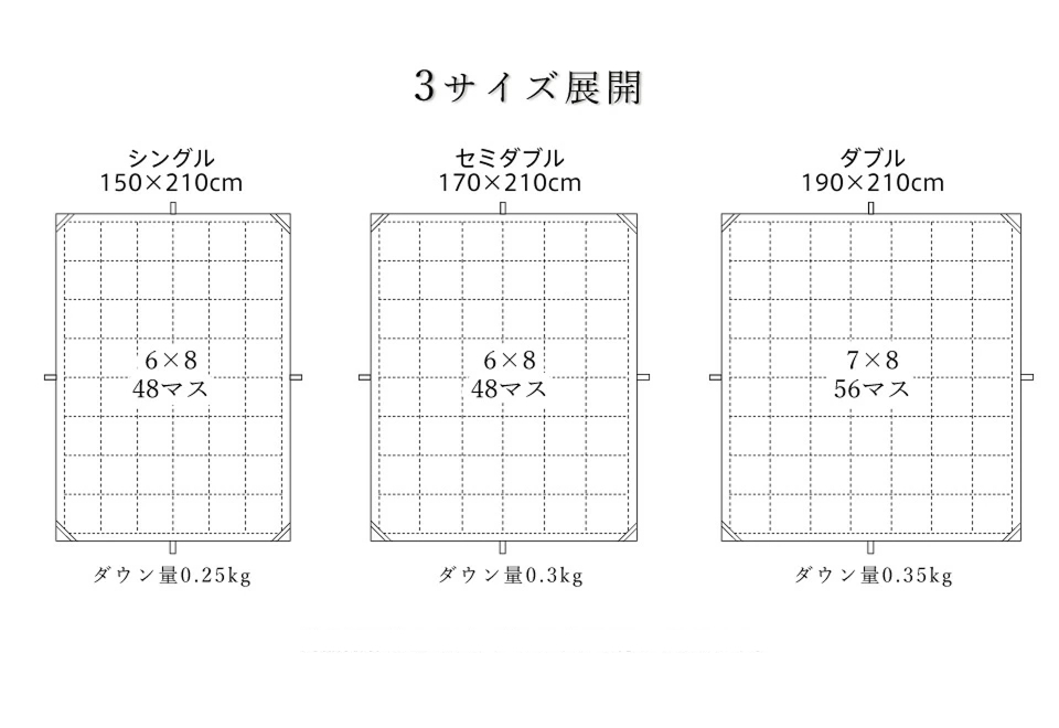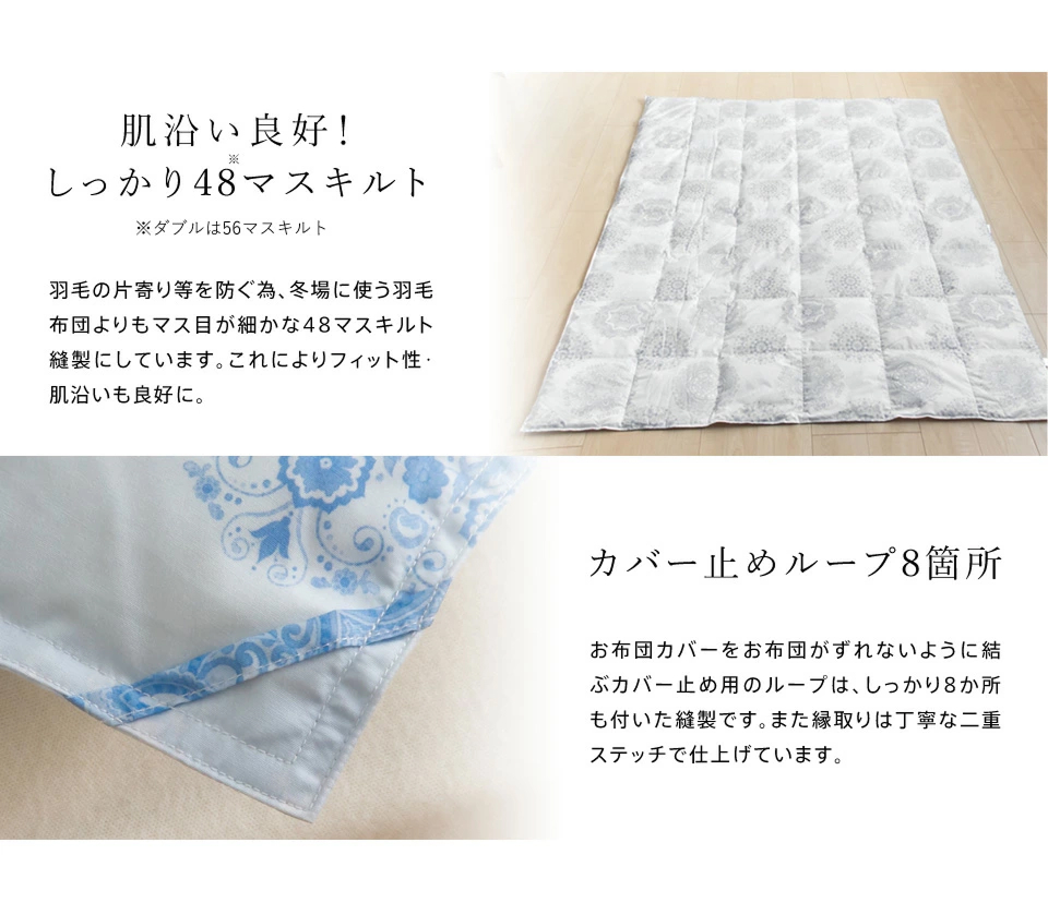 羽毛の片寄等を防ぐ為、冬場に使う羽毛布団よりもマス目が細かな48マスキルト縫製にしています。これによりフィット性・肌沿いも良好に。(ダブルは56マスキルト)