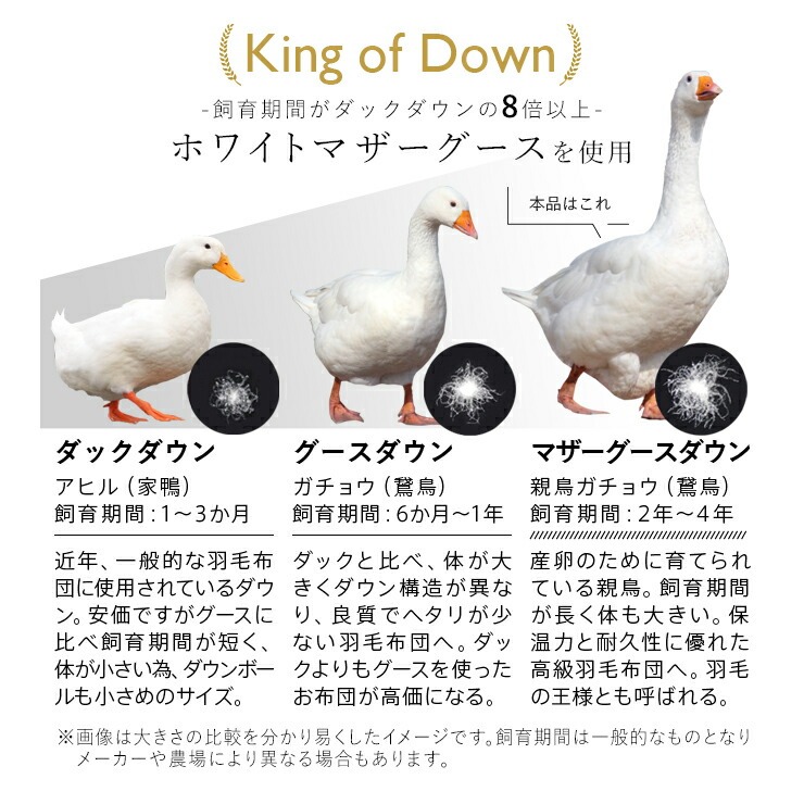 2年以上の長期飼育でじっくりと育てられた親鳥マザーグースから採取される羽毛を使用しています。大きく成熟したダウンボールは弾力性・保温性に優れ、ふんわりとした膨らみが長く続きます。植物性の餌で育つため臭いが少なく、清潔で上質な仕上がり。まさに“羽毛の王様”と呼ばれるマザーグースダウンです。