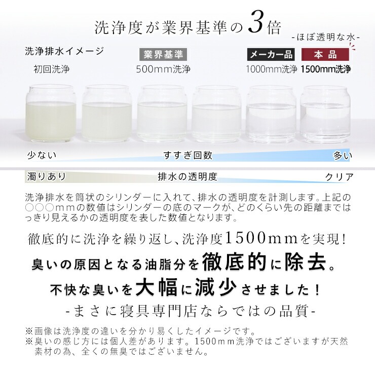 家庭用品品質表示法ではダウン率の表示誤差±5%は認められている為、多少高めのダウン率を表示する販売会社も存在します。本品は通常より厳格な「最低でも93%」の品質表示です。第三者検査機関(QTEC等)で定期的なチェックを行い、厳格な管理のもと93%を下回らない品質を維持しています。さらに国内でパワーアップ加工を施し、ファイバーやゴミ等を綺麗に除去します。さらに高圧と高熱でダニや細菌等も消滅させ、ふっくらとしたかさ高を保ちます。質の高い羽毛布団には必須となる工程です。