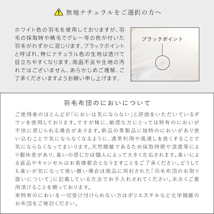 羽毛のパワーアップから羽毛充填・製品化まで、全て日本国内で行っております。大量生産型ではない小規模工場で一枚ずつ丁寧に熟練の職人が製造しています。また加工所や生産工場に頻繁に出向き、羽毛の状態や生産状況の管理をプロ目線で行っております。お布団に縫い付けられたネームは私たちが製品に対して「責任を持つ」という証です。また、通常のご使用において万が一不具合が生じた場合は無償交換・修理いたします。末永くご愛用いただけることを心から願っております。