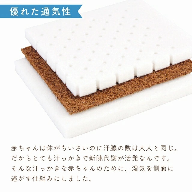 ・赤ちゃんはとても汗っかき。大人の2倍以上の汗をかくとも言われています。赤ちゃんの城が独自開発した「エコホールサンドマット」は通気性に優れた三層構造の敷布団。敷布団の赤ちゃんが触れる面にたくさんの通気口がありそこから、湿気をすって横から逃がす構造になっています。