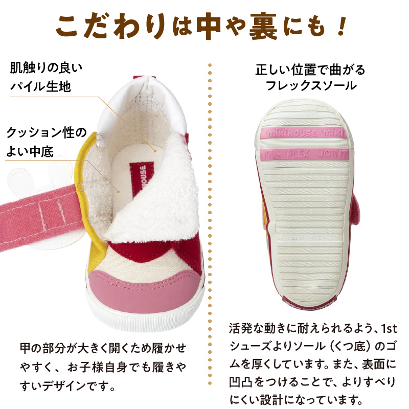 合皮に刺繍を打った顔のモチーフにギンガムチェックのベロ部分など、ミキハウスらしさが沢山詰まったプレミアム感のあるシューズです。