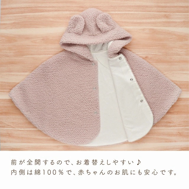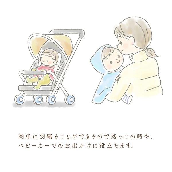 サッと羽織らせたり脱ぎ着がしやすいマント。ねんねからあんよまで長く使えます。
