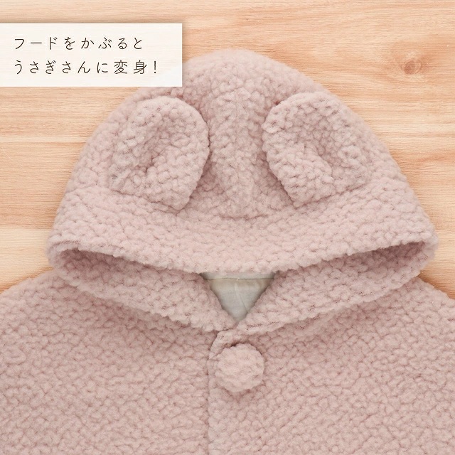 マント(もこもこうさぎ)_マント もこもこうさぎ 脱ぎ着しやすい あったかマント 3ヶ月 ~ 2才 長く使える フリース 軽い やわらかい フード うさぎ 胸元 ポンポン シンプル 防寒アイテム 日本製 ベビー用品 赤ちゃん ベビーウェア 子供服 福岡県 久留米市 赤ちゃんの城 送料無料_Sx027
