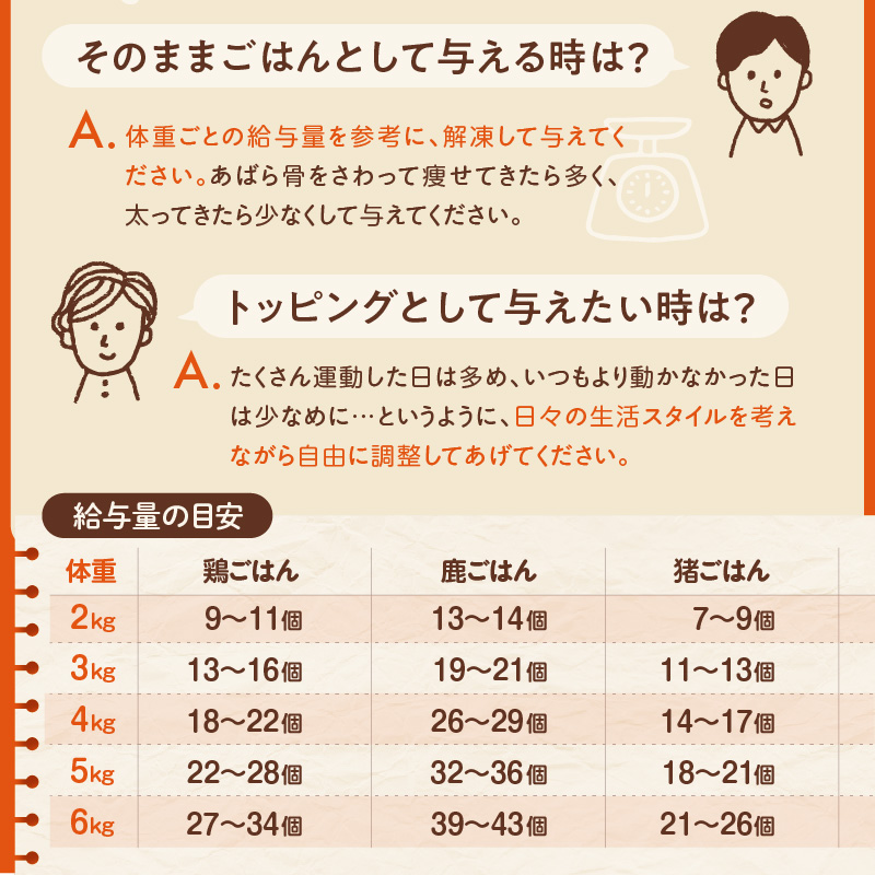 鶏もも肉、桜島鶏ささみ、国産野菜(さつまいも、人参、小松菜、舞茸)、米(白米、黒米)、焼きあごだし(長崎県平戸産)、ブルーベリー、キウイ、オリーブオイル、海藻(アイルランド西海岸産)、生酵素