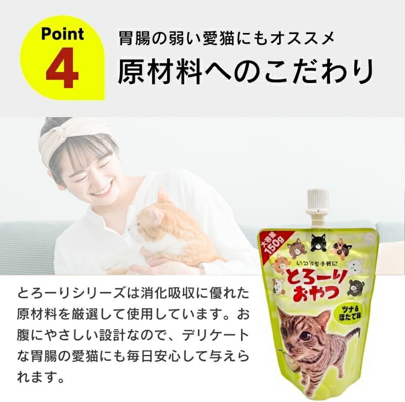 厳選されたツナ&ほたてをたっぷり使用し、丁寧に調理することで、本来の旨みをぎゅっと凝縮しました。猫ちゃんが大好きなツナ&ほたての風味を存分に楽しめる一品です。
