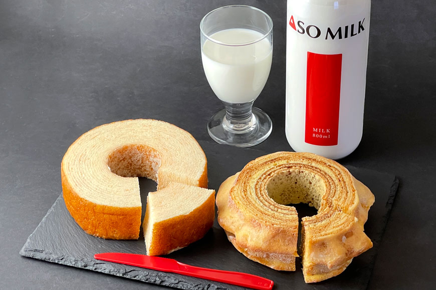 ASO MILK FACTRYで人気のバウムクーヘン2種とASOMILK800ml×1本をセットでお届けします!