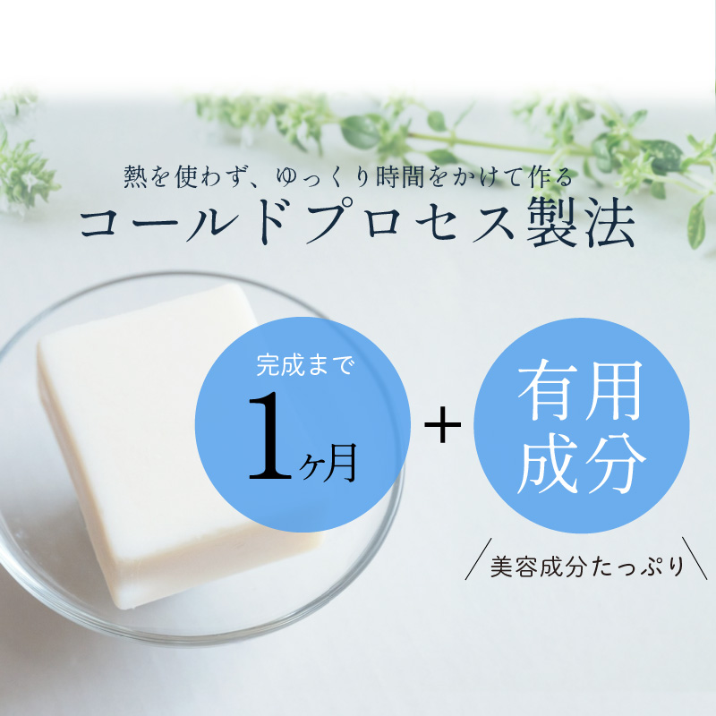 コールドプロセス製法で約1ヶ月かけて丁寧に手作りされています。この製法により有用成分が失われず、お肌に優しい特性を保ちます。
