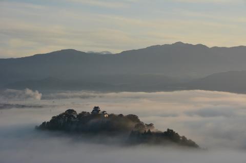 【日本三大“天空の城”】四方を山々に囲まれた大野盆地。毎年10月から4月の気象条件が揃った日には、まちが雲海に覆われ山の上の「越前大野城」だけが顔を出し“天空の城”となる絶景を見ることができます。