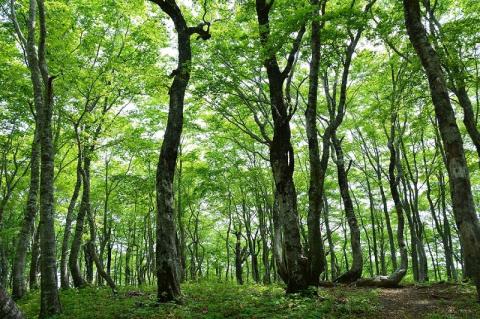 【新緑の眩しい「平家平」】約1万本ものブナが約40haにわたって生い茂る森。樹齢400年以上のトチノキの巨木やミズバショウの群落なども点在しています。
